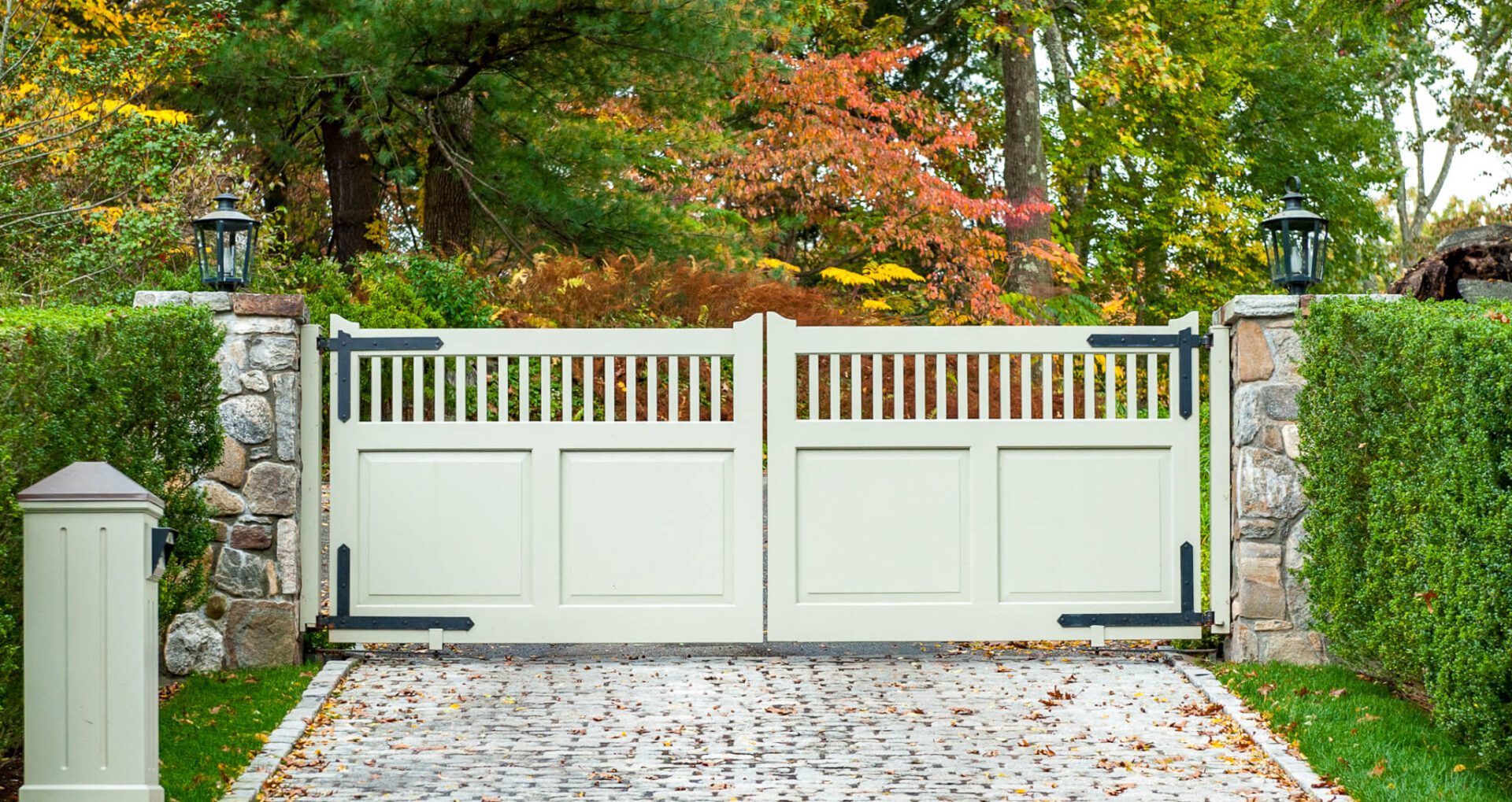 Colors can play a significant role in a design’s impact. This all-white gate conveys a classic look and feel. The solid panels provide privacy for the property owners, while the gently scalloped pickets above add visual interest.